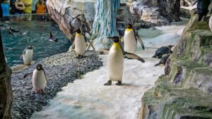 You can see five species of penguins, walking in snowy environments or gracefully sliding underwater in a spacious habitat.